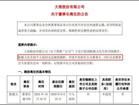 上任不到一年,大商股份董事長兼CEO陳德力辭職。10月10日,大商股份發布關于董事長離任公告稱,公司于近日收到陳德力先生的書面...